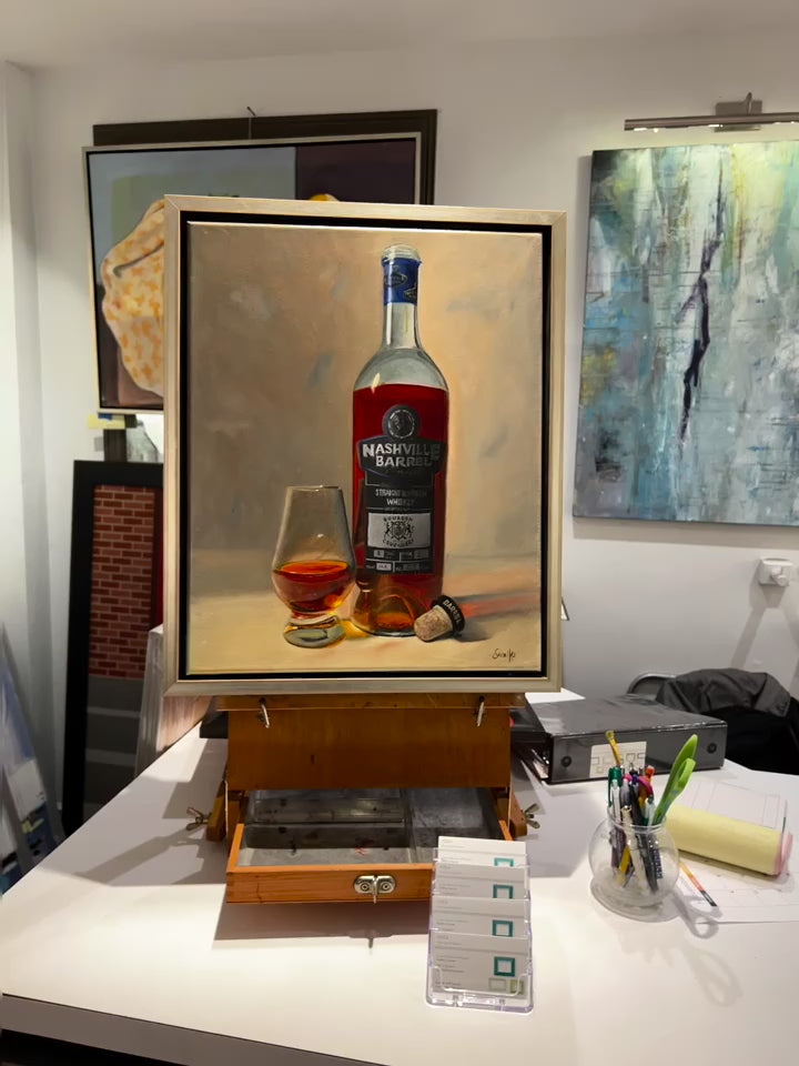 ナッシュビル バレル社のバーボンを手描きしたバーボン アート油絵で、ご自宅に洗練された雰囲気を添えましょう。この見事な静物画には、シングル バレル ナッシュビルの精巧なディテールと、お部屋を生き生きとさせる鮮やかな色が描かれています。