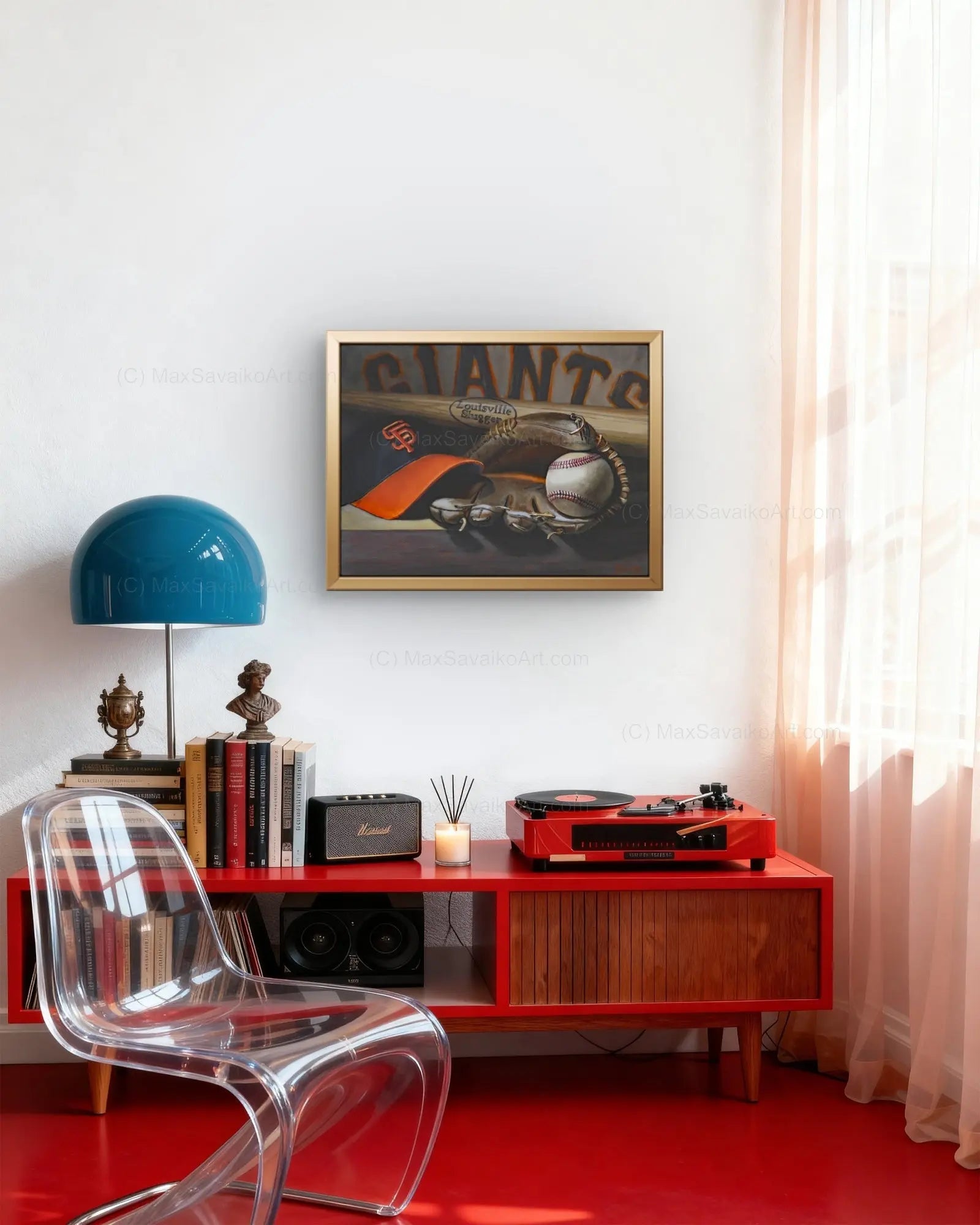 Genuine Oil Painting - 14" x 18" Medium: Oil on Linen This original artwork features an SF Giants-themed composition with a hat, ball, and bat. As this piece has already been sold, your purchase will commission a bespoke recreation, which can be personally signed by your favorite person.